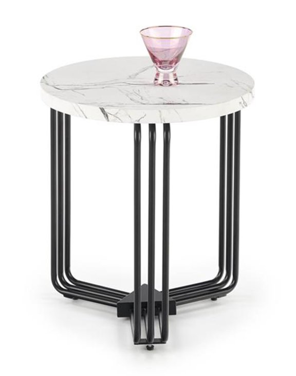 Imitacja białego marmuru w połączeniu z potrójną podstawą wybarwioną na czarny kolor sprawia, że stolik jest niezwykle elegancki, zatem sprawdzi się także we wnętrzach inspirowanych stylem industrialnym