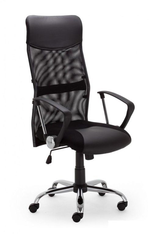 Oparcie fotela Plus tapicerowane jest przewiewną siatką, natomiast górna część oparcia tapicerowana jest ekoskórą w kolorze czarnym.