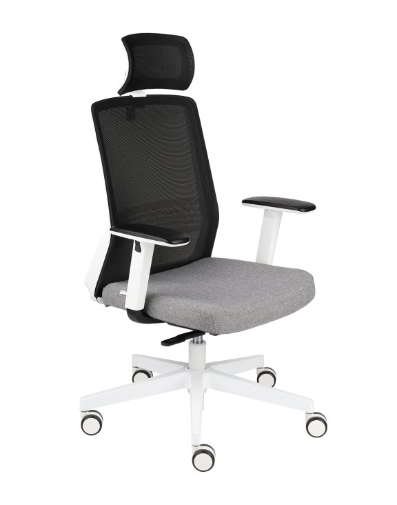 Zagłówek jest wyraźnie profilowany i tapicerowany czarną siatką - tak jak oparcie.