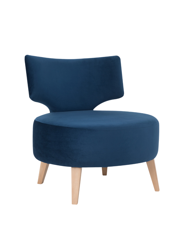 Jego projekt opiera się przede wszystkim na wyjątkowo szerokim siedzisku, oryginalnym oparciu i niewysokich, drewnianych nóżkach.