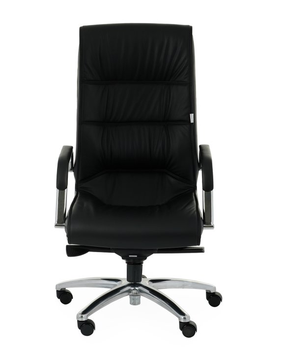 Front fotela tapicerowany jest naturalną wysokojakościową skórą licową, miłą w dotyku, dostępną w 3 kolorach: czarnym, kremowym i brązowym.
