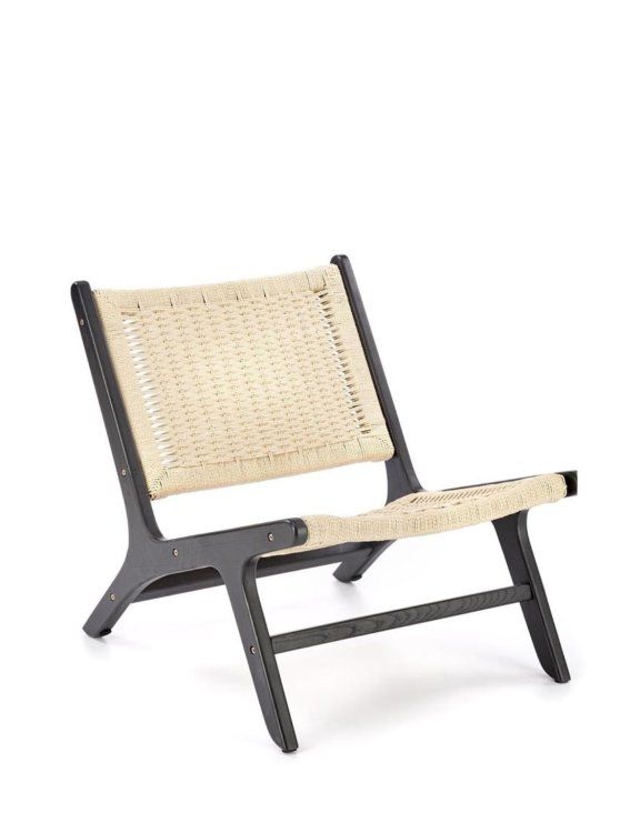 Fotel wypoczynkowy Foden marki Halmar w kolorze czarnym z jasnym, naturalnym sznurkiem, to wyjątkowy mebel, który wyróżnia się swoim rustykalnym urokiem w stylu boho.
