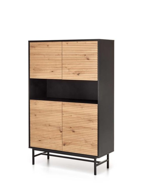 Ciepły odcień dębu artisan stylowo kontrastuje z czernią korpusów i nóżek.