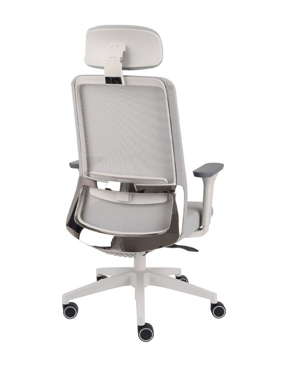 Oparcie tapicerowane jest wytrzymałą siatką w kolorze jasno-szarym.