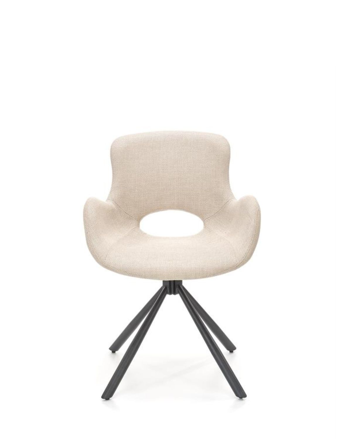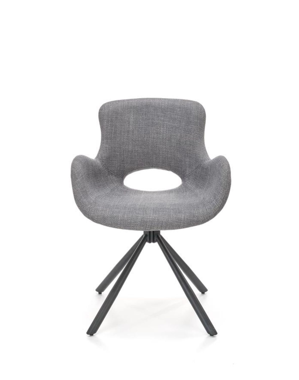 Krzesło jest tapicerowane tkaniną o ciekawej strukturze, które występuje w dwóch kolorach: popiel i beż.