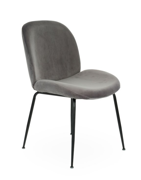 Krzesło jest tapicerowane miłą w dotyku tkaniną welwetową w kolorze szarym, a nóżki wybarwione są na kolor czarny.