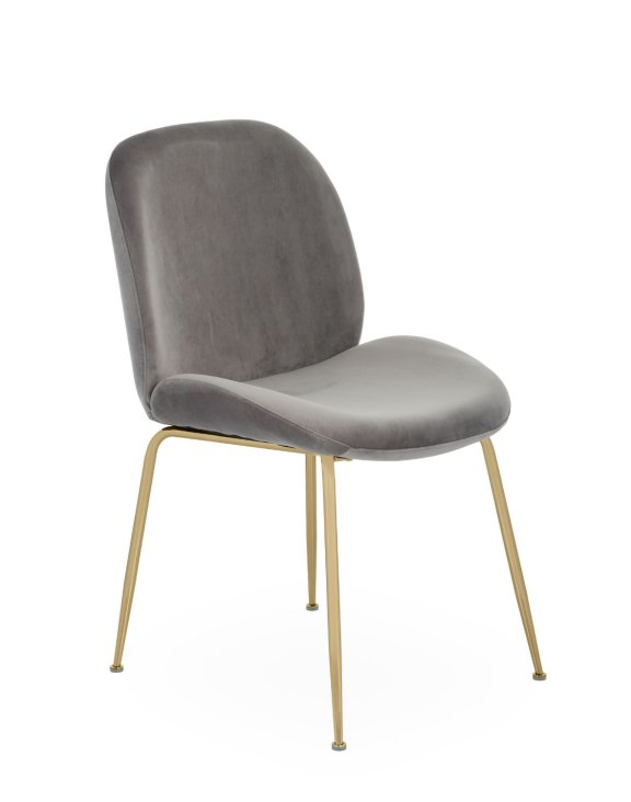 Krzesło jest tapicerowane miłą w dotyku tkaniną welwetową w kolorze szarym, a nóżki wybarwione są na kolor złoty.