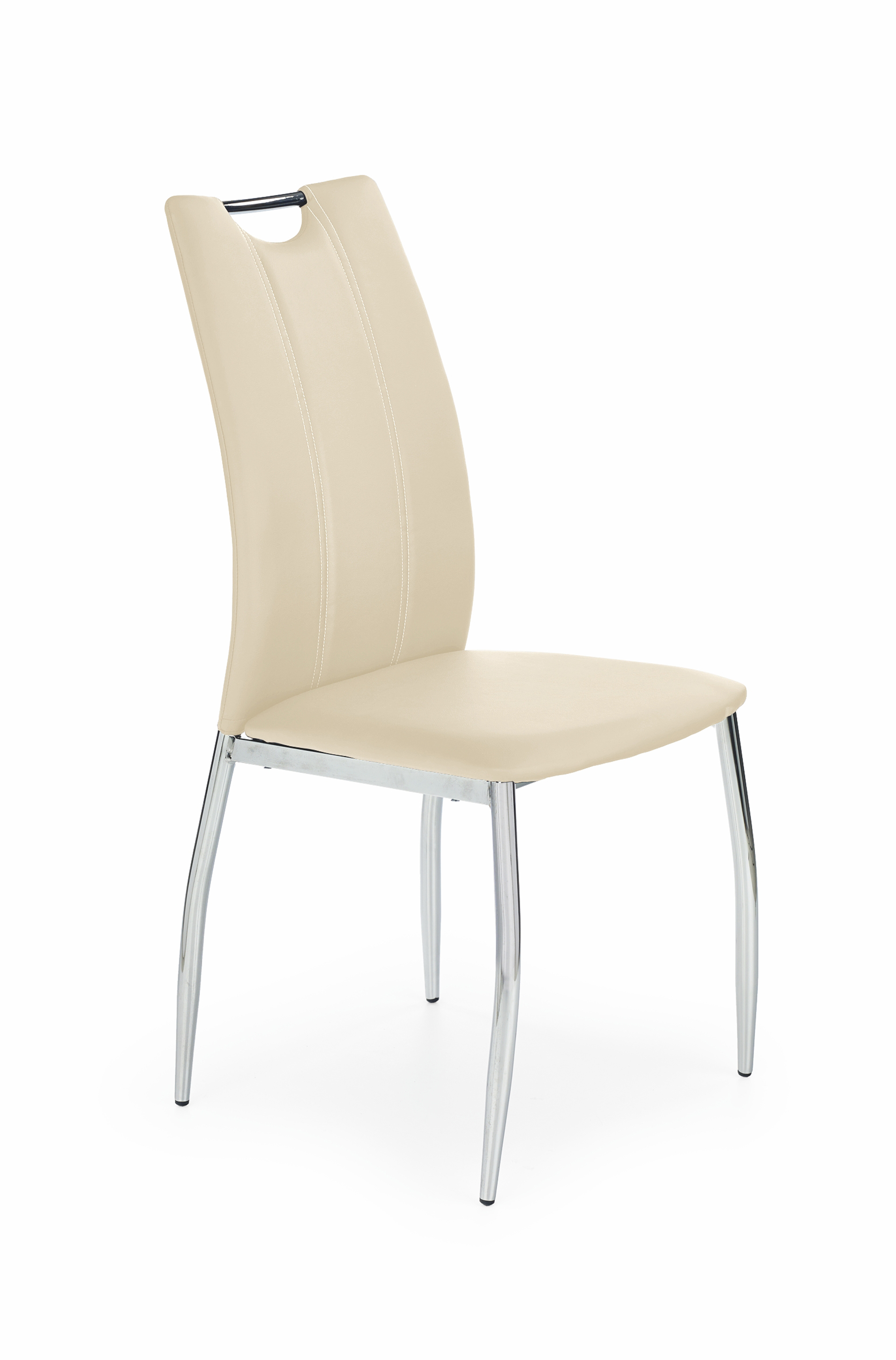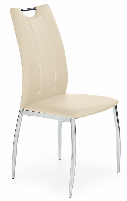 Krzesło K187 posiada wysokie, profilowane oparcie (52 cm wysokości) wykonane z miękkiej ekoskóry w dwóch kolorach: beżowym lub czarnym.