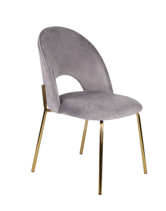 Krzesło do jadalni Molly Gold w kolorze szarym ze złotymi nóżkami i miękką w dotyku tapicerką i designerska forma oparcia wpisuje się swą estetyką w najnowsze trendy wnętrzarskie.