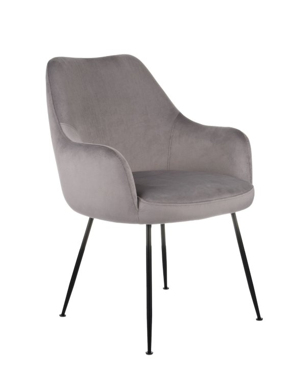 Krzesło jest tapicerowane miłą w dotyku tkaniną welwetową w szarym kolorze.