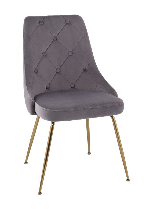 Krzesło jest tapicerowane miłą w dotyku tkaniną welwet w szarym i beżowym kolorze.