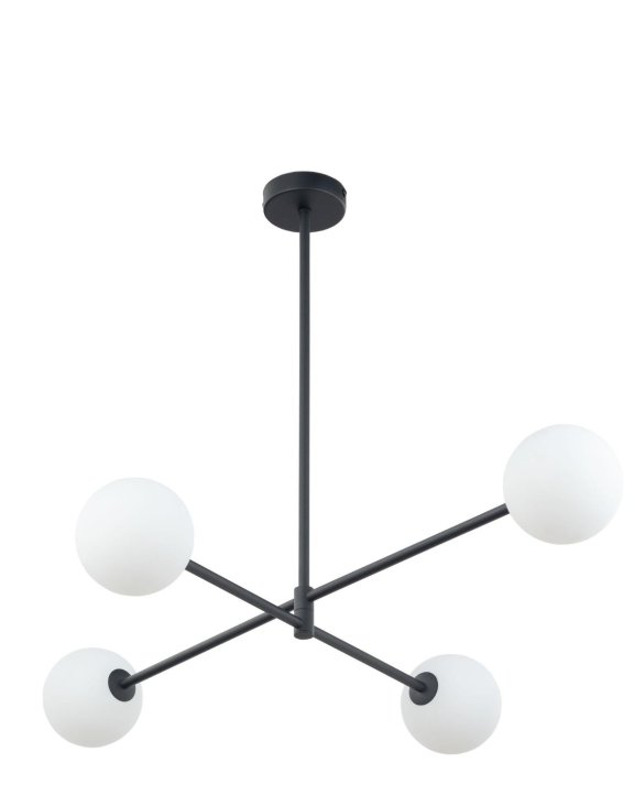 Lampa sufitowa Sarius Black 4 wysoka marki TK Lighting tworzą cztery białe, szklane i kuliste klosze.