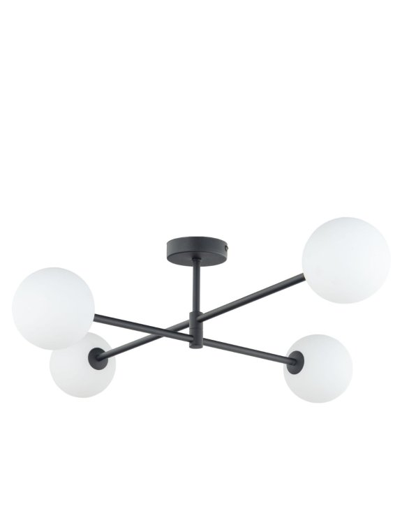 Lampa sufitowa Sarius Black 4 marki TK Lighting tworzą cztery białe, szklane i kuliste klosze.