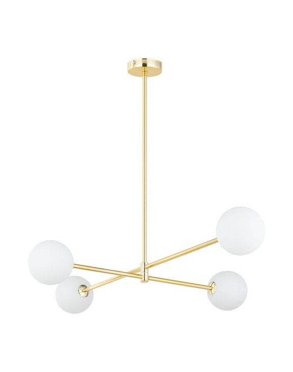 Lampa sufitowa Sarius Gold 4 wysoka marki TK Lighting tworzą cztery białe, szklane i kuliste klosze.