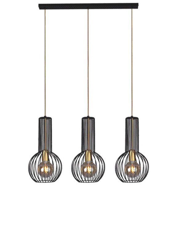 Trzy ażurowe klosze umieszczone na kablach w złotym kolorze pięknie eksponują umieszczone wewnątrz żarówki.