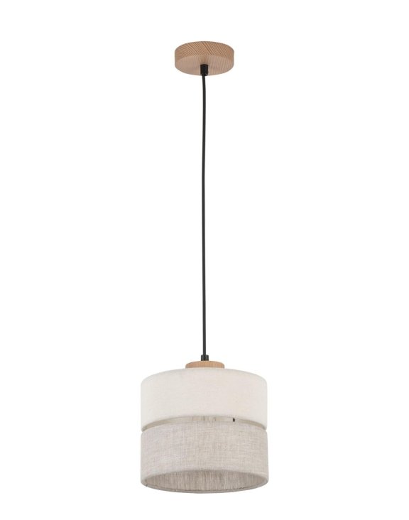 Klosz wykonany jest z dwukolorowych abażurów w kolorze szaro-beżowym, który w środku skrywa żarówkę.