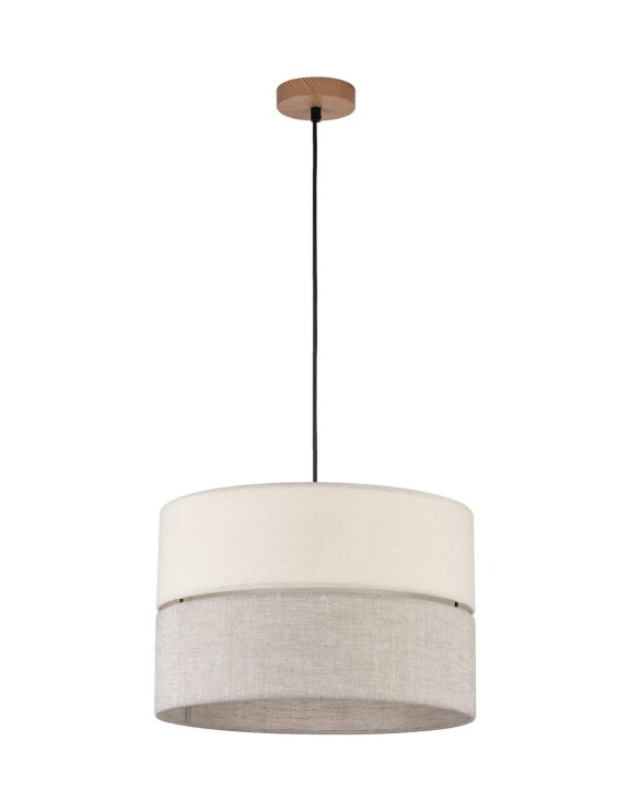 Klosz wykonany jest z dwukolorowych abażurów w kolorze szaro-beżowym, który w środku skrywa żarówkę.