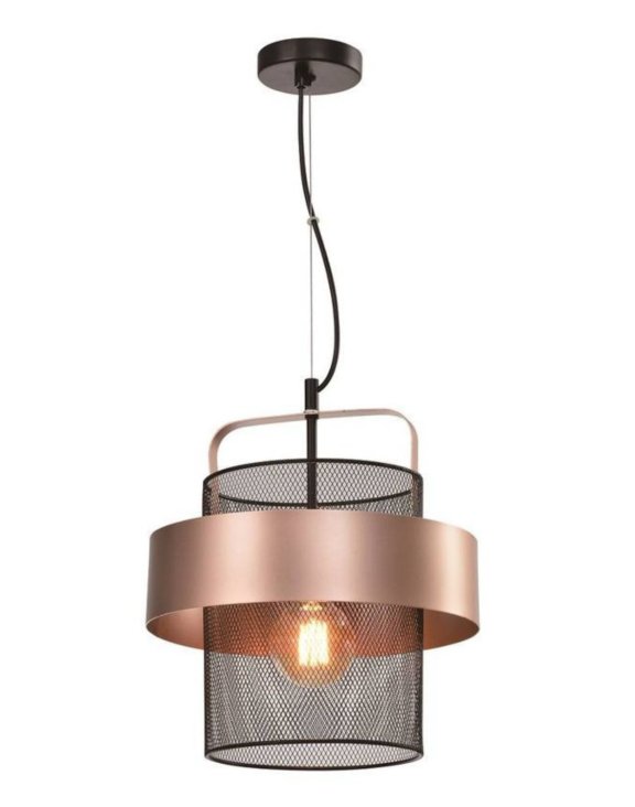 Podsufitka lampy, kabel i siatkowy klosz są w kolorze czarnym, smaku z pewnością dodaje miedziany element umiejscowiony dookoła abażura lampy.