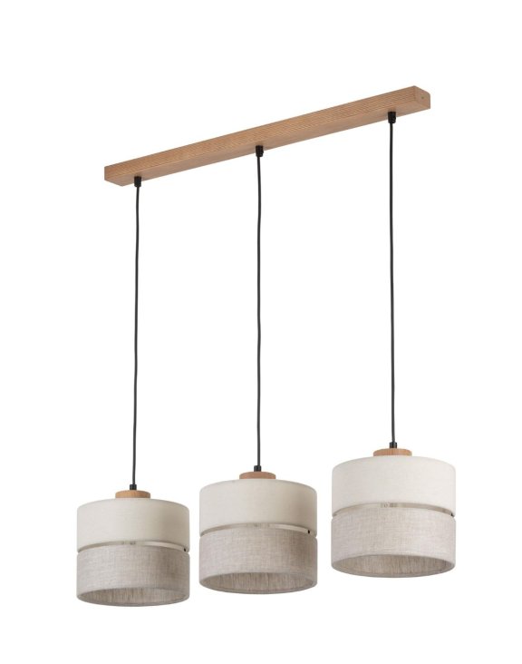 Trzy klosze wykonane są z dwukolorowych abażurów w kolorze szaro-beżowym, które w środku skrywają żarówki.