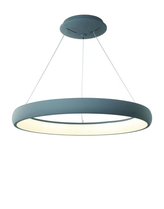 Klosz w formie obręczy o średnicy 61 cm wykonano z aluminium w szarym kolorze.