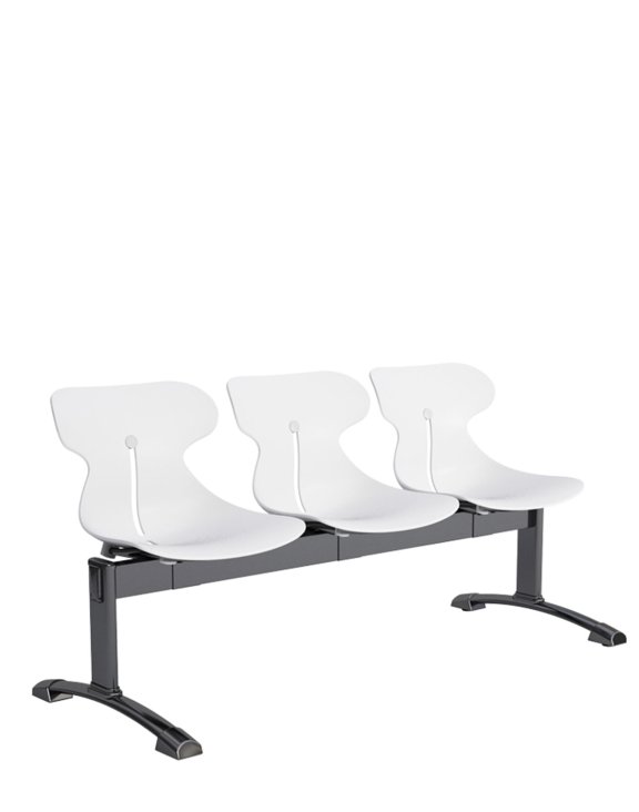 Ławka 3-osobowa na stalowej czarnej konstrukcji z wyraźnie profilowanymi siedziskiem i wyróżniającej stylistyce.