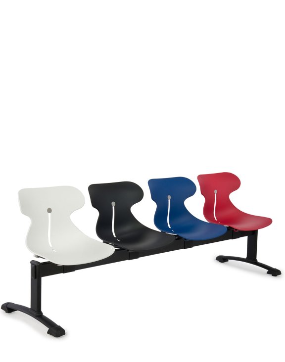 Ławka 4 - osobowa na stalowej czarnej konstrukcji z wyraźnie profilowanymi kubełkiem dostępnym w 6 kolorach.