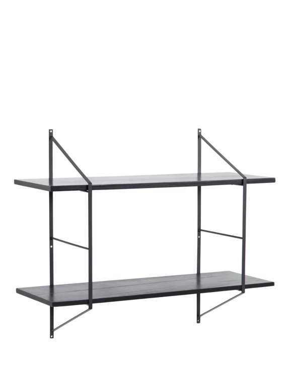 Dwie półki drewniane, lakierowane na kolor czarny, połączone metalowym stelażem w kolorze czarnym tworzą nowoczesną formę, odpowiednią do wnętrz w stylu industrialnym, nowoczesnym, czy minimalistycznym.