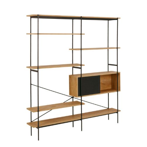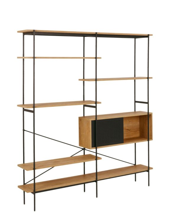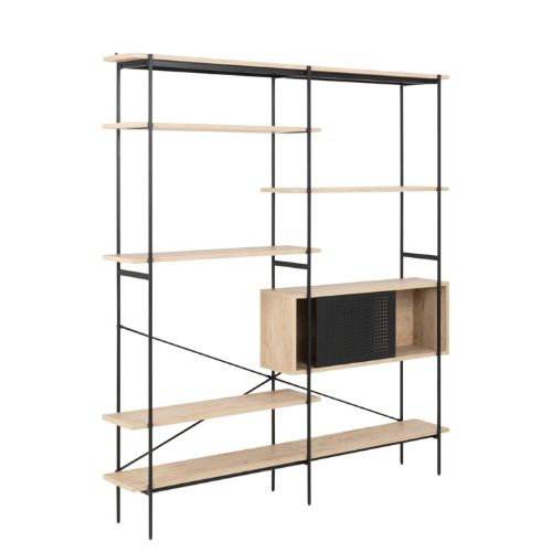Dodatkową praktyczną cechą regału Angus jest mała szafka zamykana na metalowe drzwi. Szafka ta oferuje dodatkową przestrzeń do przechowywania przedmiotów, które można schować, aby utrzymać porządek i estetyczny wygląd wnętrza.