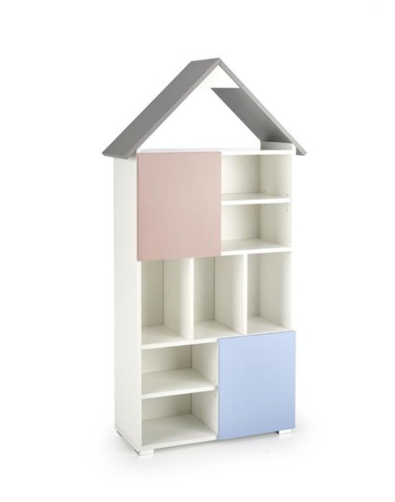 Regał ma kształt uroczego domku, który dodaje mu uroku i zabawności. Różne kolorowe wykończenia, takie jak róż, niebieski i szary wprowadzają radość i kolor do przestrzeni dziecięcego pokoju.