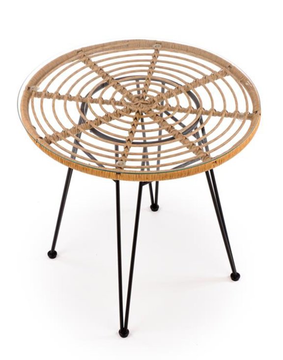 Okrągły blat o średnicy 79 cm wykonano ze szkła, a następnie nałożono go na metalowy stelaż opleciony rattanem syntetycznym.
