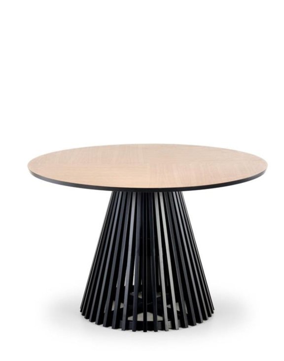 Podstawę stołu stanowi designerski stożek, złożony z czarnych lameli oraz blatu o unikatowym dekorze.