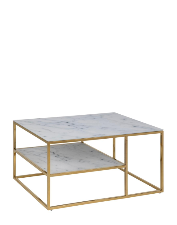 Stolik jest wyposażony w kwadratową półkę, której blat jest powtórzeniem marmurowego wzoru.