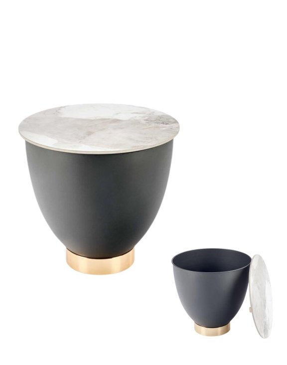 Styl stolika można określić jako glamour. Zestawienie stali malowanej proszkowo ze złotym wykończeniem oraz biały marmurem idealnie wpasowuje się zarówno do nowoczesnych, jak i bardziej eleganckich wnętrz.