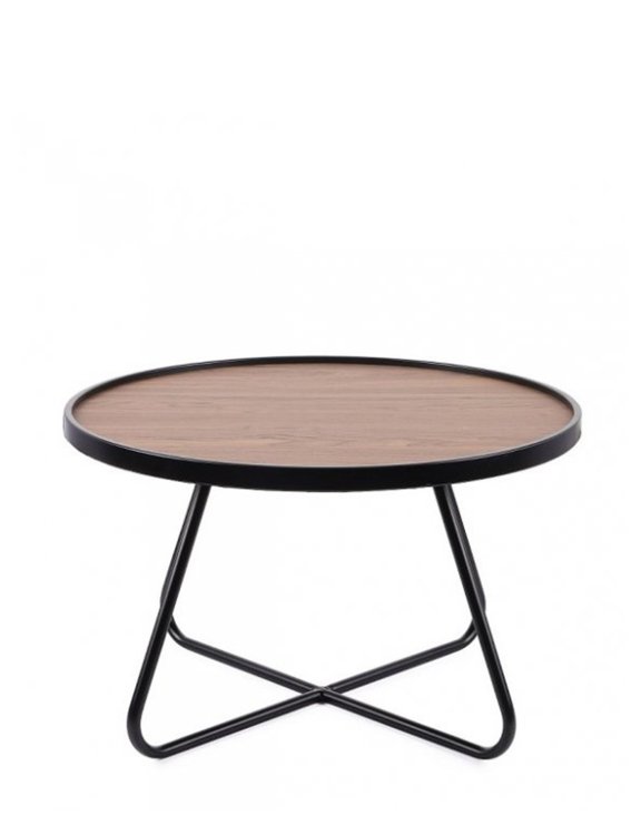 Okrągły blat został osadzony w metalowej ramie, która na dole przechodzi w krzyżującą się podstawę. Stanowi to ciekawy efekt wizualny, a jednocześnie stolik jest bardzo stabilny.
