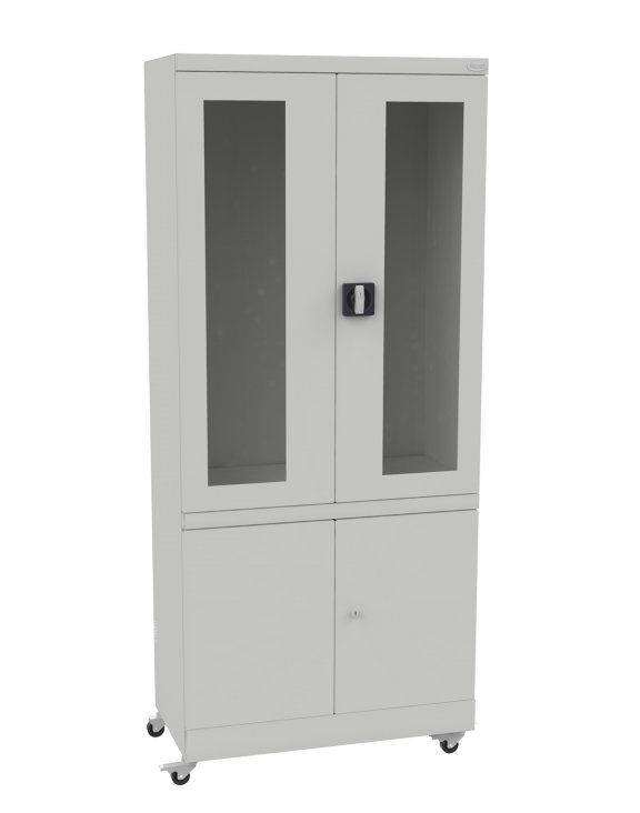 W górnej części szafy są dwie szklane półki przestawne co 25 cm zamykane przeszklonymi drzwiczkami natomiast w dolnej jest jedna szklana półka zamykana drzwiczkami z pełnej blachy.