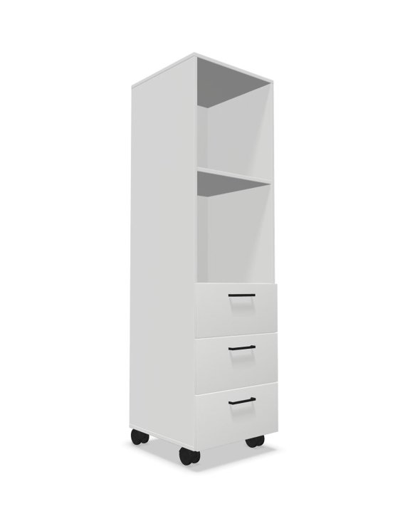 Trzy szuflady regału to praktyczne przestrzenie, które mogą pomieścić zarówno drobne akcesoria biurowe, jak i dokumenty o różnym formacie.