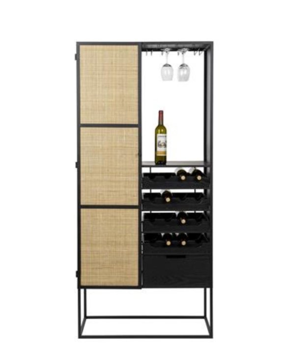 Szafka/barek na alkohol wykonany jest z lakierowanego drewna MDF z naturalnymi frontami z rattanu oraz z metalowych nóg malowanych proszkowo.