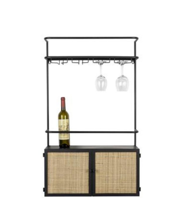 Barek na alkohol wykonany jest z lakierowanego drewna MDF z naturalnymi frontami z rattanu oraz z metalowych nóg malowanych proszkowo.