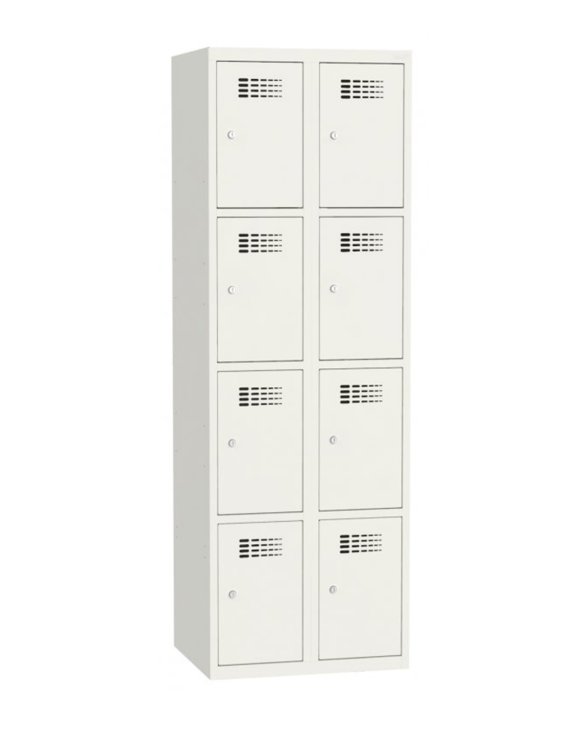 Seria SUS W 324 marki Malow to metalowe szafki z czterema skrytkami na rzeczy osobiste w dwóch kolumnach.