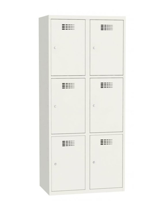 Prezentowane szafki mają moduły o szerokości 40 cm. W jednym module znajdują się trzy komory ubraniowe. Oferowana szafka posiada dwa moduły. Szafki z większą lub mniejszą ilością skrytek w module można zobaczyć w zakładce Produkty z rodziny.