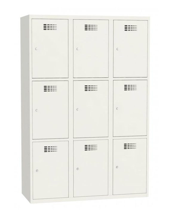 Prezentowane szafki mają moduły o szerokości 40 cm. W jednym module znajdują się trzy komory ubraniowe. Oferowana szafka posiada trzy moduły. Szafki z większą lub mniejszą ilością skrytek w module można zobaczyć w zakładce Produkty z rodziny.