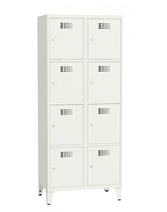 Prezentowane szafki mają moduły o szerokości 40 cm. W jednym module znajdują się cztery komory ubraniowe. Oferowany rodzaj posiada dwa moduły. Szafki z większą lub mniejszą ilością skrytek w module można zobaczyć w zakładce Produkty z rodziny.