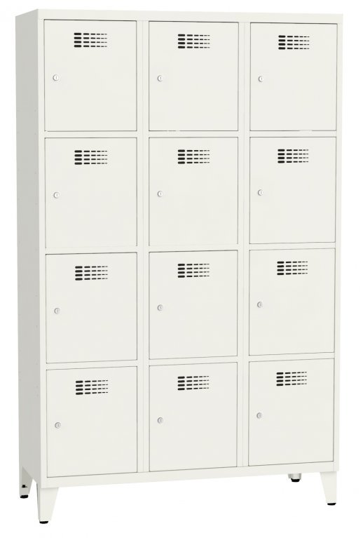 Prezentowane szafki mają moduły o szerokości 40 cm. W jednym module znajdują się cztery komory ubraniowe. Oferowany rodzaj posiada trzy moduły. Szafki z większą lub mniejszą ilością skrytek w module można zobaczyć w zakładce Produkty z rodziny.