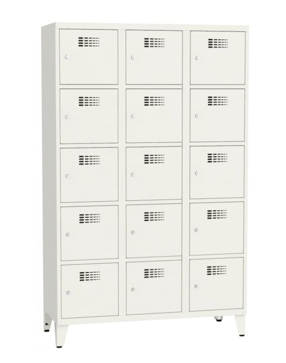 Prezentowane szafki mają moduły o szerokości 40 cm. W jednym module znajdują się pięć komór ubraniowych. Oferowany model posiada trzy moduły. Szafki z większą lub mniejszą ilością skrytek w module można zobaczyć w zakładce Produkty z rodziny.