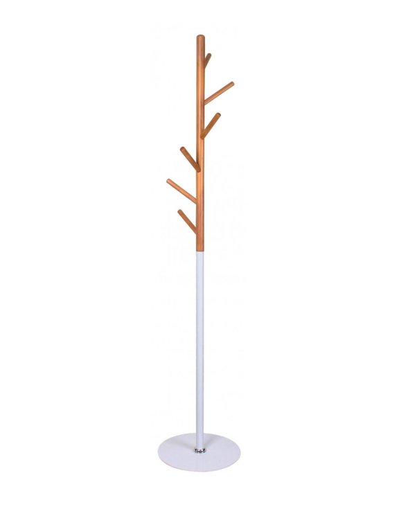 Wieszak wykonany jest z połączenia stali malowanej proszkowo na kolor biały i drewna bukowego.