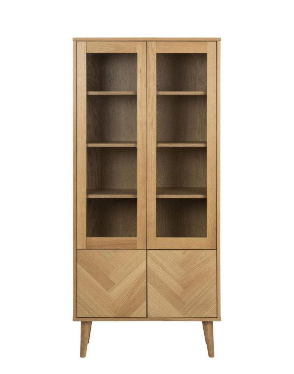Drewniana witryna idealnie pasować będzie do jadalni lub salonu. Została wykonana z forniru dębowego w kolorze naturalnego dębu.