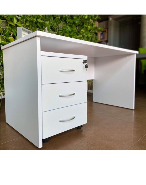 Zestaw składający się z białego prostego biurka i białego kontenerka na kółkach, to niezbędne meble, które pozwolą na wygodną i komfortową naukę oraz pracę.