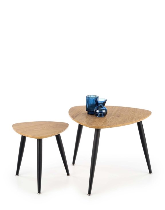 Ławy posiadają trójkątny kształt blatów o zaokrąglonych kantach. W zestawieniu z czarnymi nóżkami produkt nabiera cech mebli loftowych.