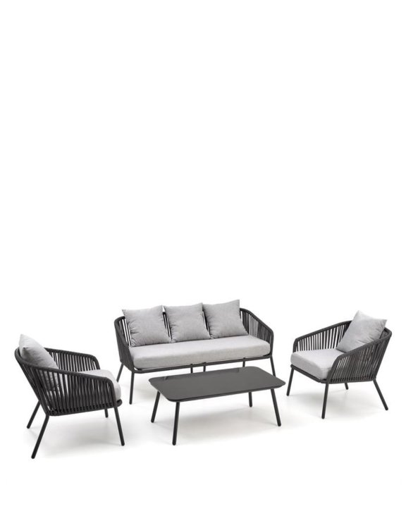 W zestawie znajduję się sofa oraz dwa fotele, które są wyplatane ciemnoszarą linką nadając meblom designerskiego wyglądu oraz stół, którego blat wykonany jest ze szkła.