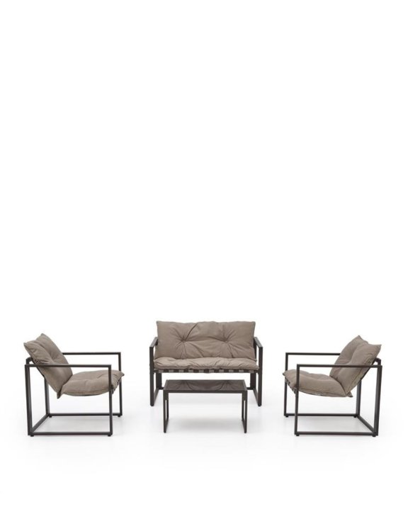 W zestawie znajduję się sofa oraz dwa fotele, których rama jest wykonana z ramy metalowej w kolorze czarnym oraz wygodnych poduszek w kolorze cappuccino nadając meblom designerskiego wyglądu oraz stół, którego blat wykonany jest ze szkła.